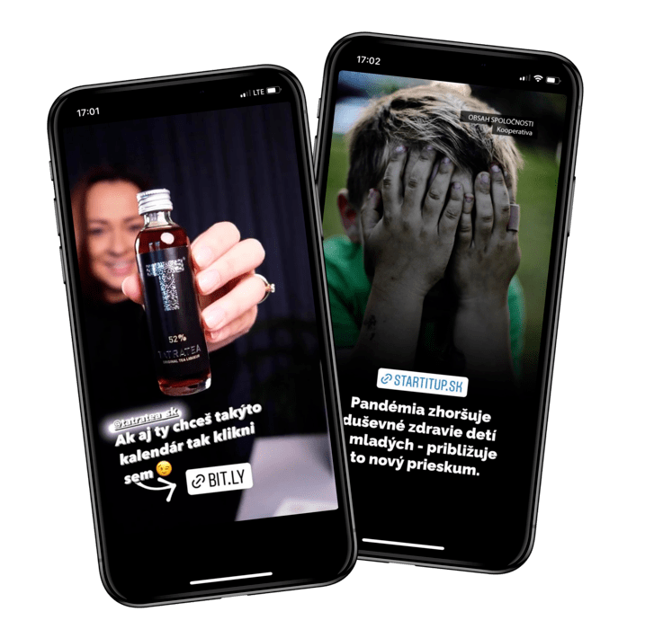 Výkonnostné Instagram stories majú jednoduchú formu – grafiku sprevádza úderný predajný text a swipe up na vašu landing page. Takéto stories zaraďujeme medzi každodenné spravodajstvo, čím prirodzene zvyšujeme počet organických impresií.